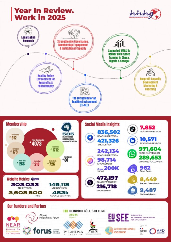 In 2025, the Nigeria Network of NGOs advanced its commitment to building a strong, inclusive, and enabling environment for civil society organisations. Through strategic programmes, capacity development initiatives, research, and digital engagement, NNNGO continued to support nonprofits to thrive, collaborate, and deliver meaningful impact.